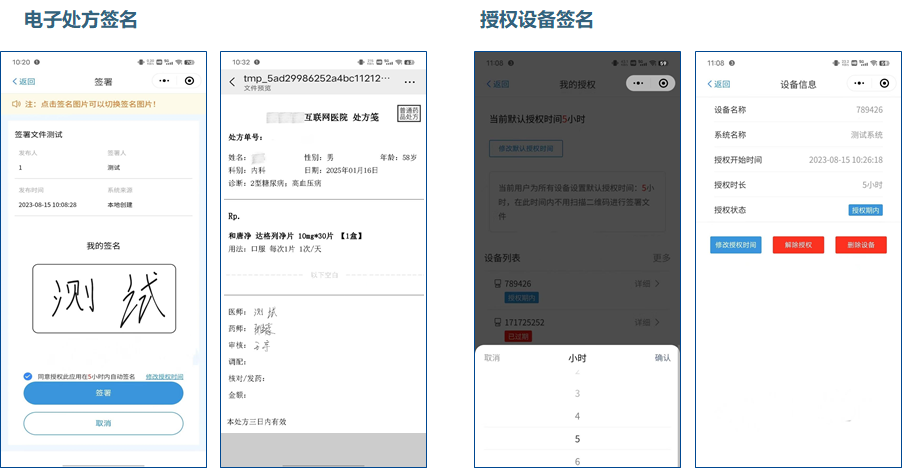 医师和药师可以通过电子签名,实现查询、处方、审核、流通、配药等环节的无缝衔接,构建起便捷的移动医疗服务站。患者发起远程诊疗后,医师开具处方、药师审核时,可直接进行电子签名,系统自动匹配电子印章,迅速生成具有法律效力的电子处方。