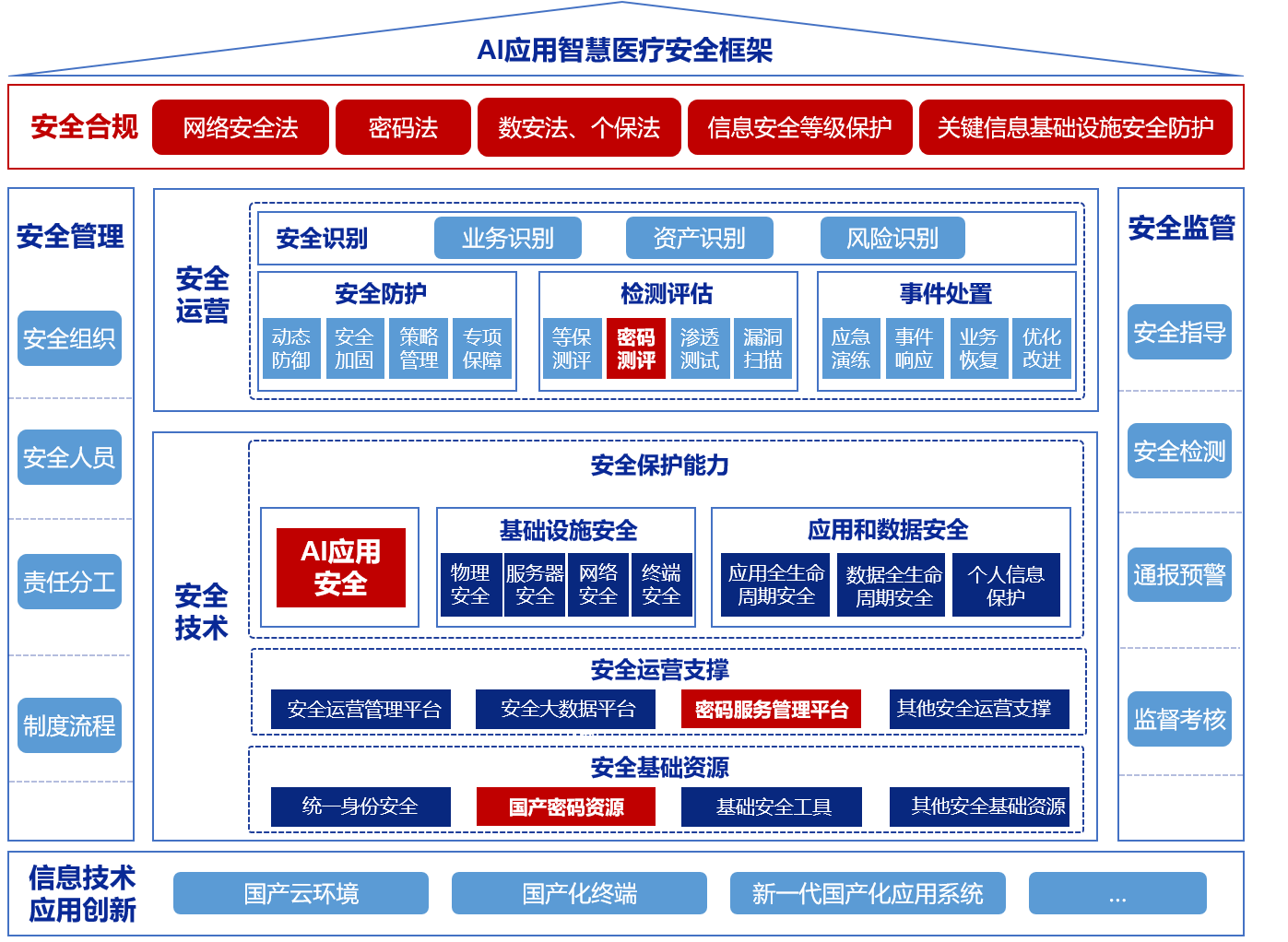 严格遵循《密码法》《医疗卫生机构网络安全办法》等国家级法律法规,创新性地将商用密码技术与AI医疗应用场景深度融合,构建覆盖数据全生命周期的安全防护体系。