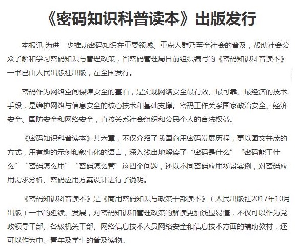 由安信公司参与,省密码管理局日前组织编写的《密码知识科普读本》一书已由人民出版社出版,在全国发行。