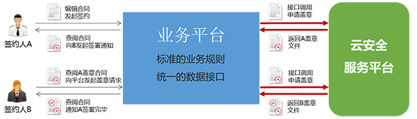 1. 电子合同业务平台通过标准API与云安全服务平台(以下简称"云平台")进行接口对接,以获取电子签名、电子签章及时间戳服务。