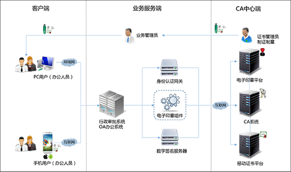 针对行政审批的安全需求,安信CA基于第三方数字证书、电子签名及电子签章等技术来保障业务办理过程中的身份真实性、数据安全性、数据完整性及操作不可抵赖性,系统架构如下图所示: